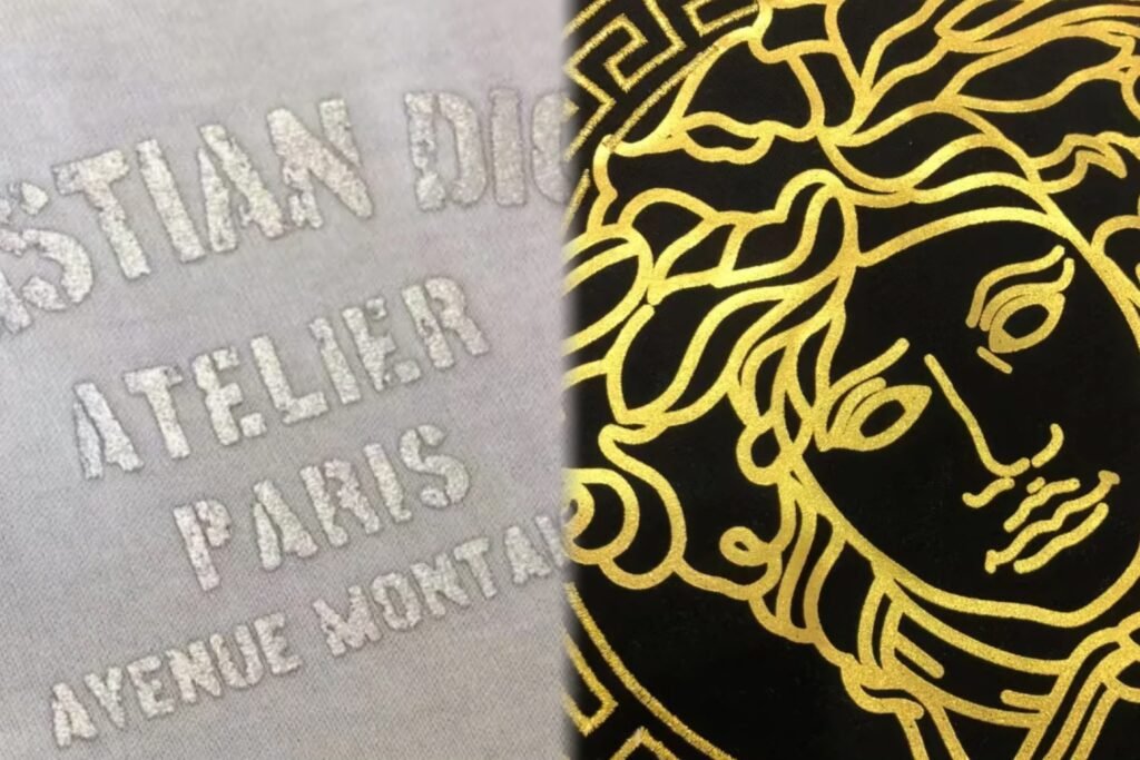 This is a two-step process. First, a special glue is screen-printed onto the garment in the design’s shape. Then, a thin sheet of metallic foil is heat-pressed onto the glue, sticking only to the printed areas.